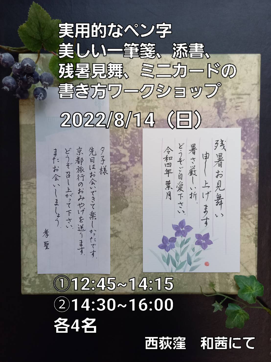 ペン、一筆箋、葉書、練習用紙などはご用意します。お気軽に手ぶらでいらしてください。
